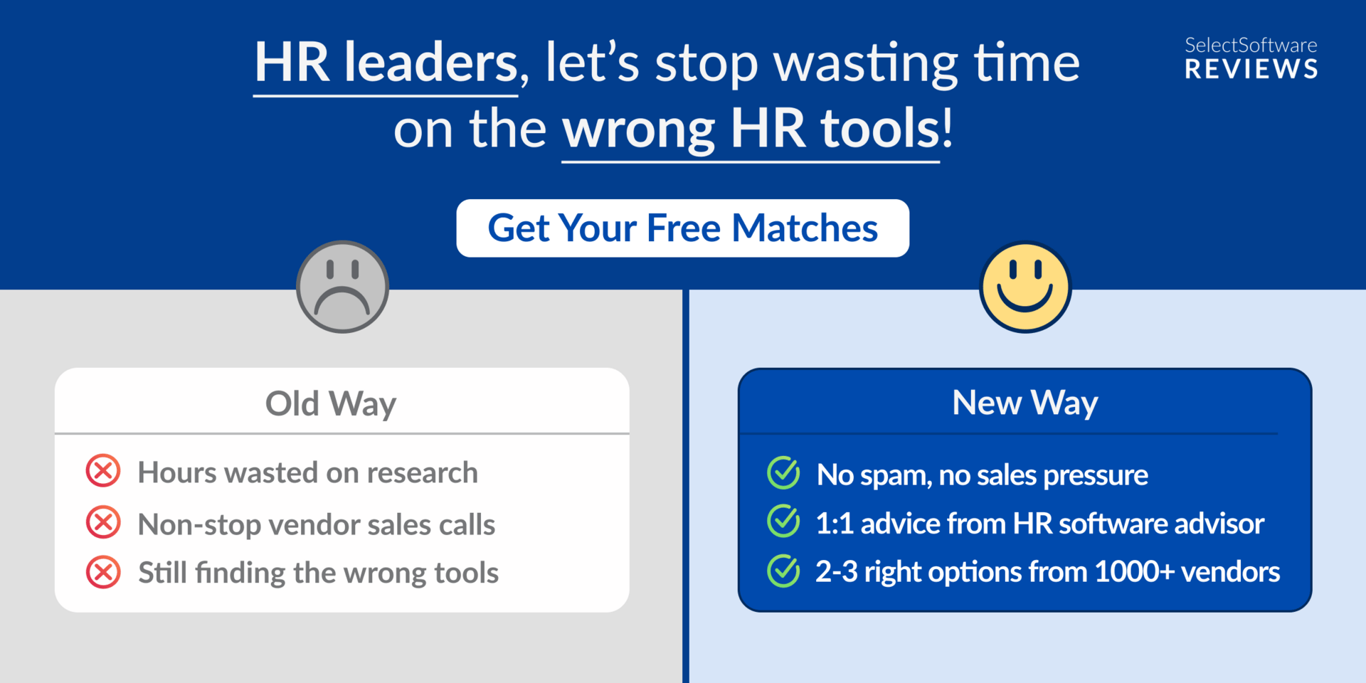 The old way of researching tools is done. HR leaders are switching to a smarter, faster way - SSR’s free HR software matching service.