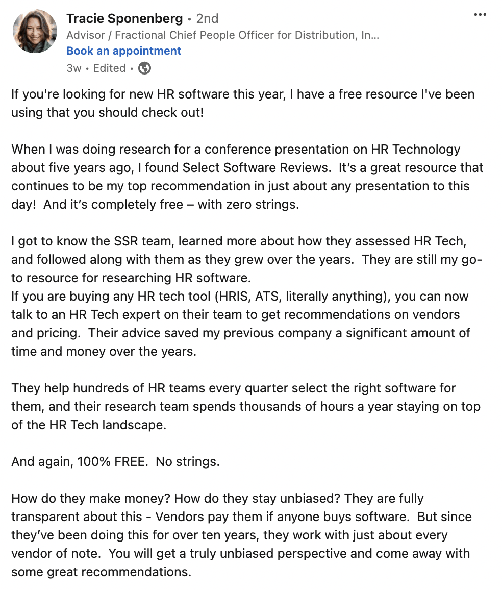 SelectSoftware Reviews is trust by HR leaders for their unbiased, expert-backed, and free HR software matching service. Their HR tech experts can save your time and help you find the right HR vendor based on your company’s unique requirements.